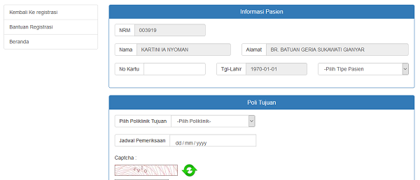 | 2. | Pasien menentukan jadwal kunjungan ke Poliklnik RSUD Kabupaten Buleleng pada menu Registrasi->[Registrasi Pasien Lama]. | |